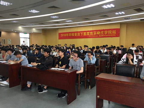 2018年5月12日,中华环保联合会与南京晓庄学院环境科学学院共同举办环境普法下基层活动暨《环境污染基本知识及维权实务》讲座,来自学院的100余名教职工和学生代表参与学习。