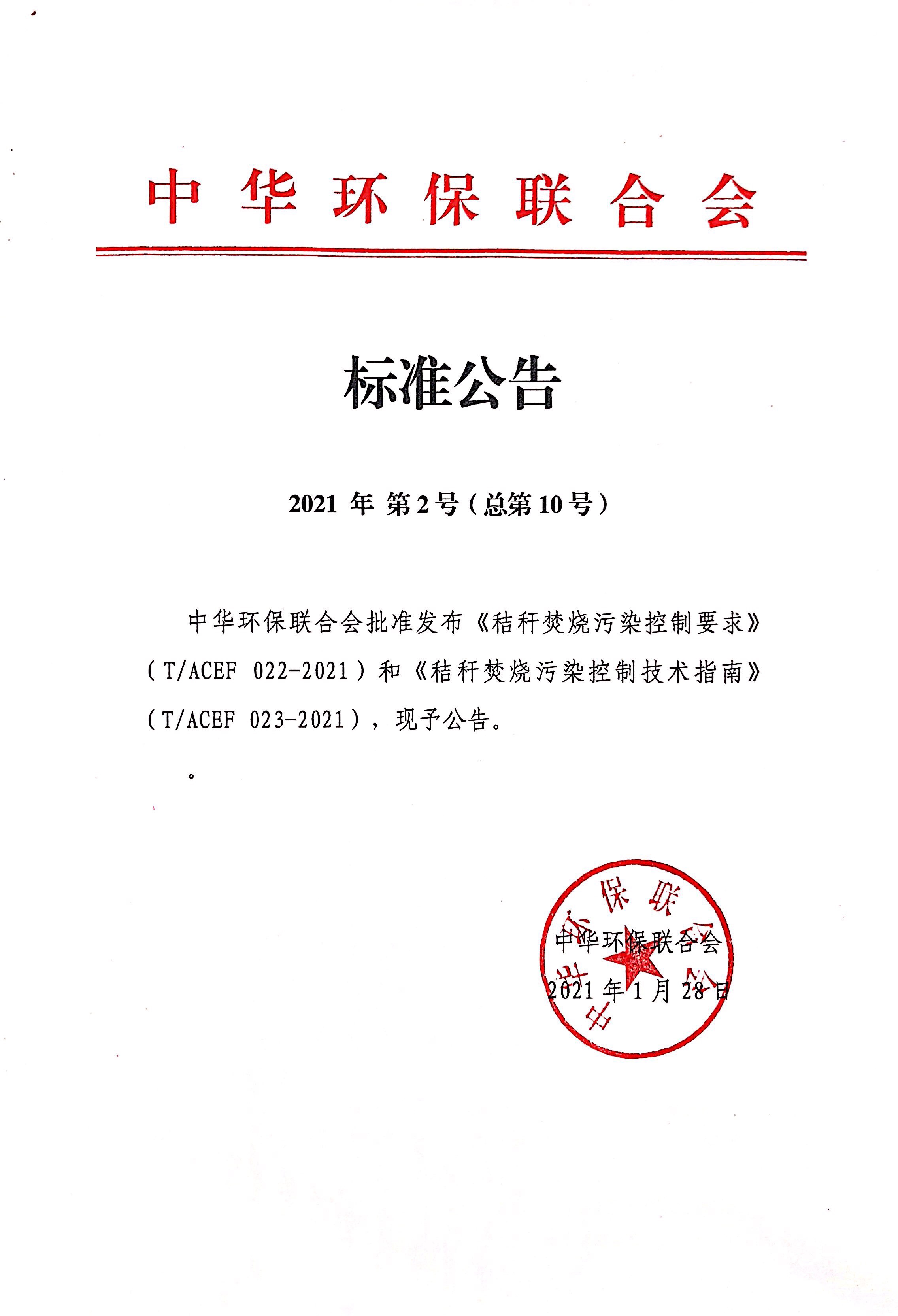 关于批准发布《秸秆焚烧污染控制要求》和《秸秆焚烧污染控制技术指南》团体标准的公告(2021 年 第2号(总第 10号))