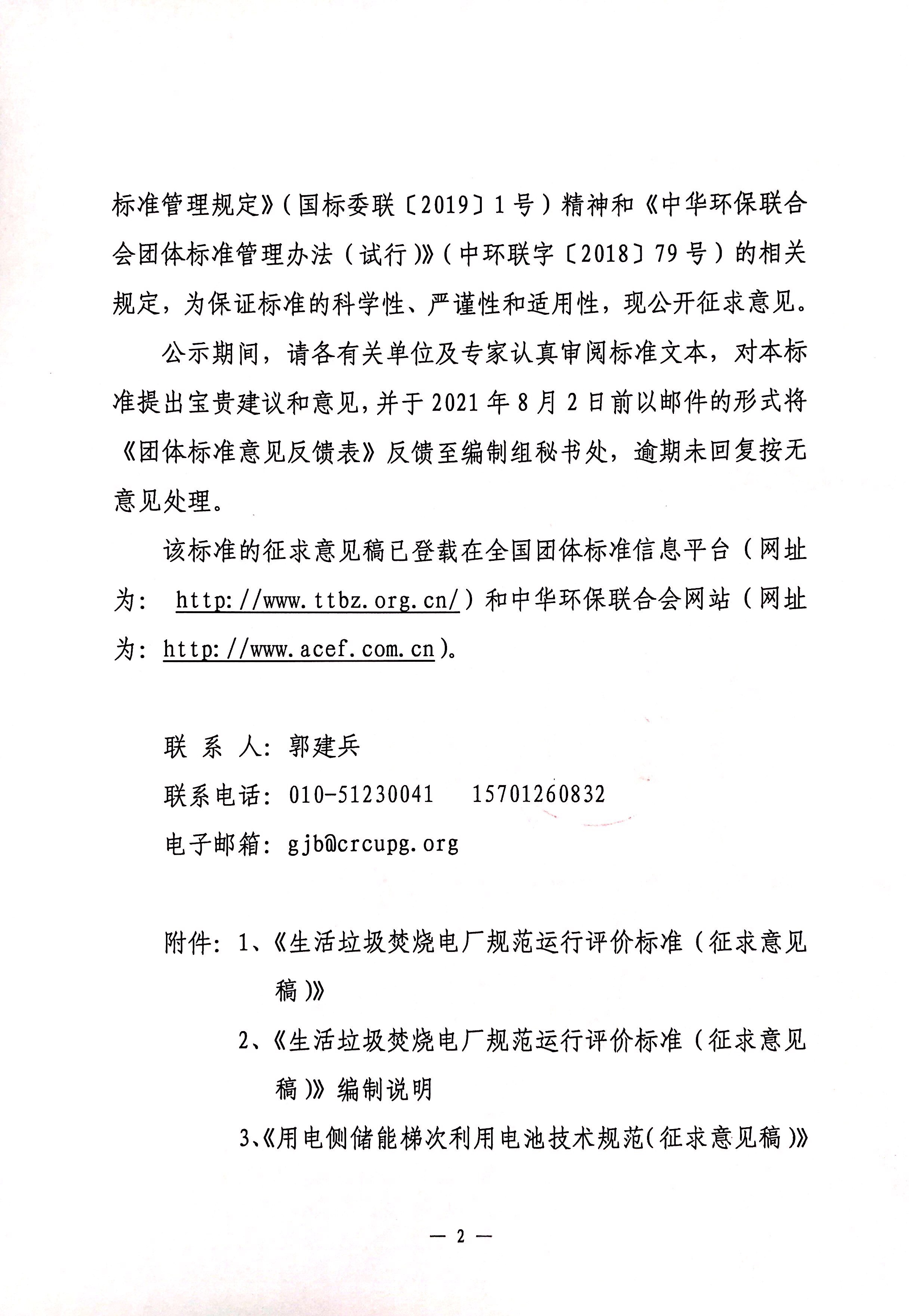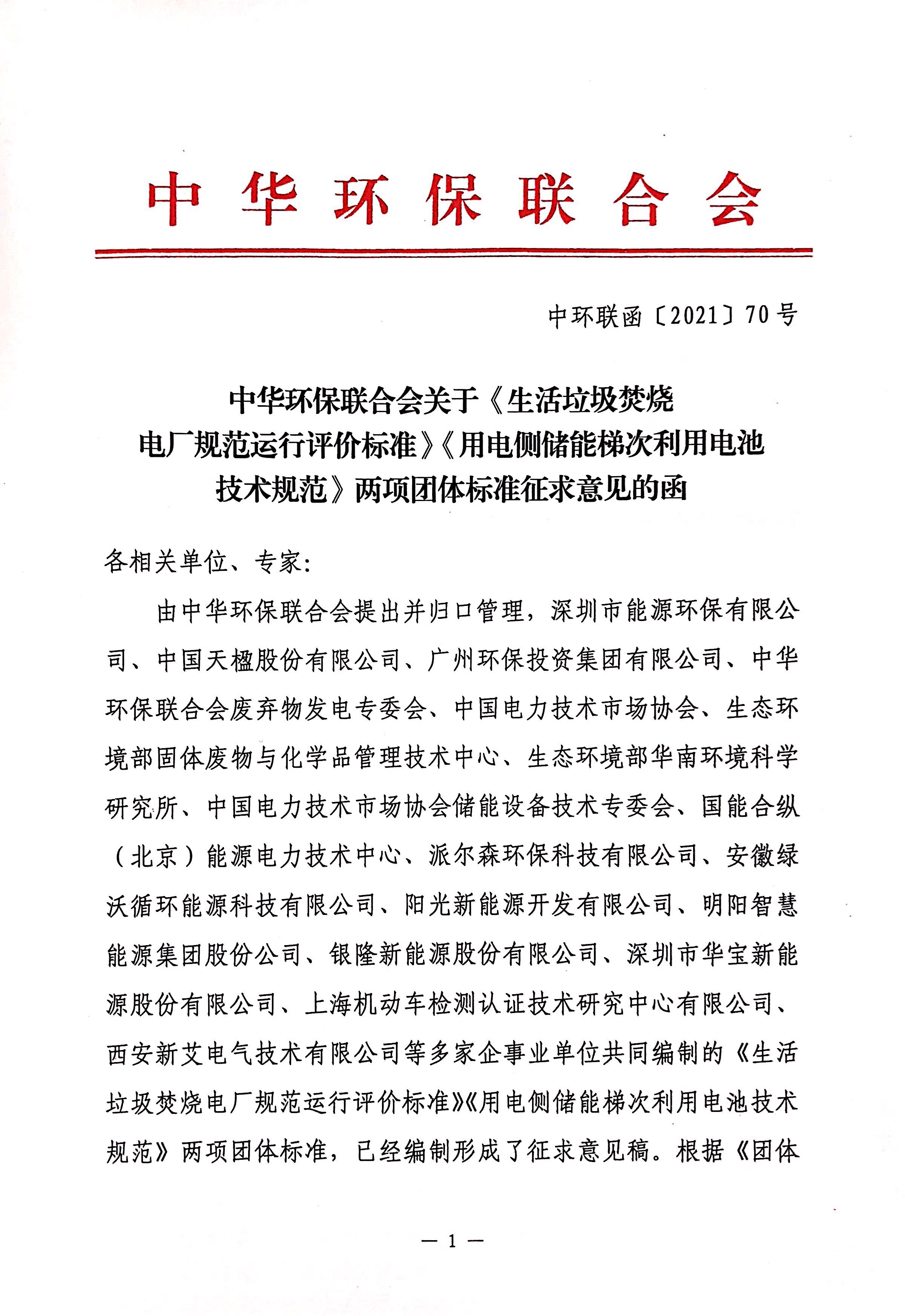 关于《生活垃圾焚烧电厂规范运行评价标准》《用电侧储能梯次利用电池技术规范》两项团体标准征求意见的函