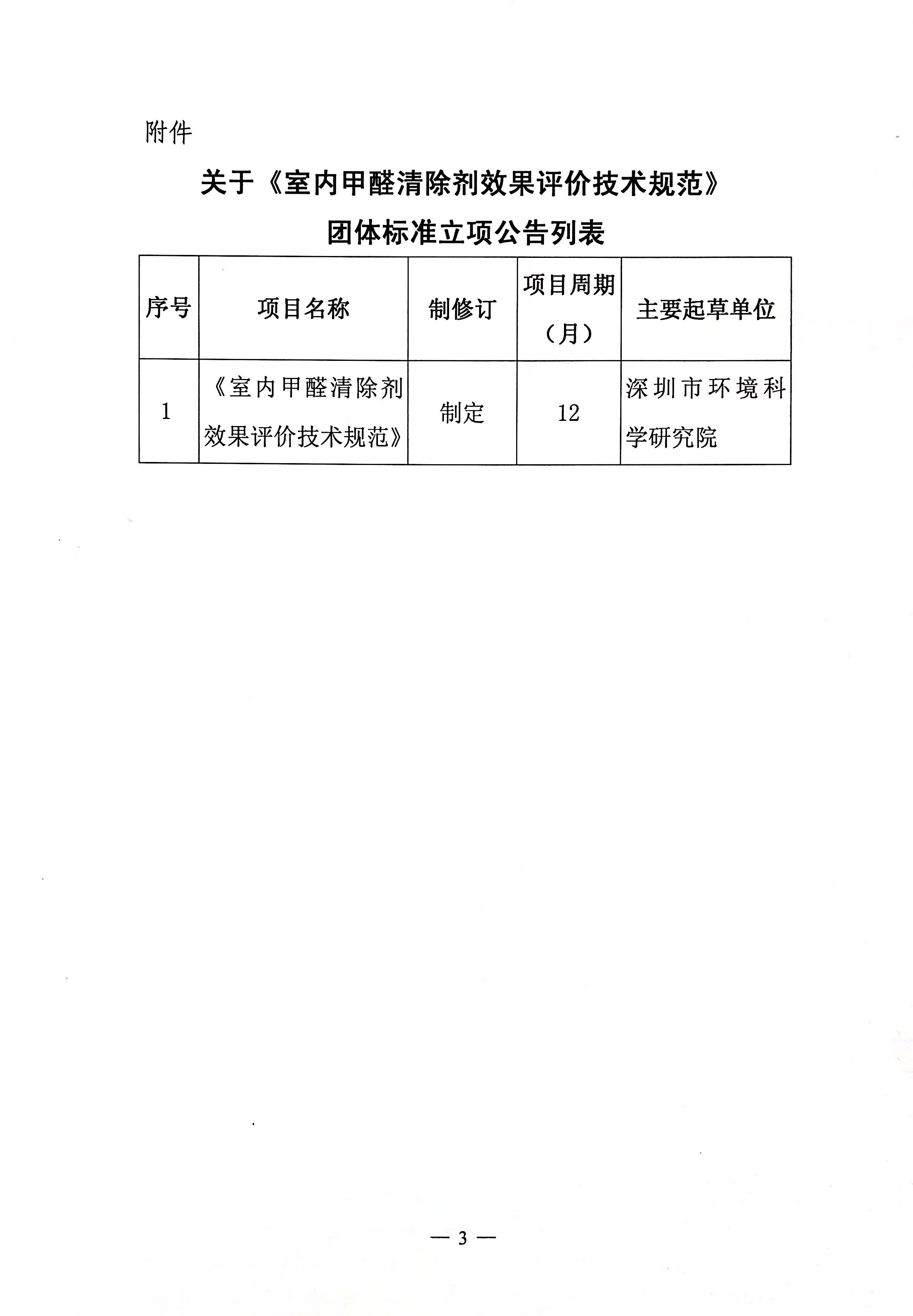 关于《室内甲醛清除剂效果评价技术规范》团体标准立项的公告