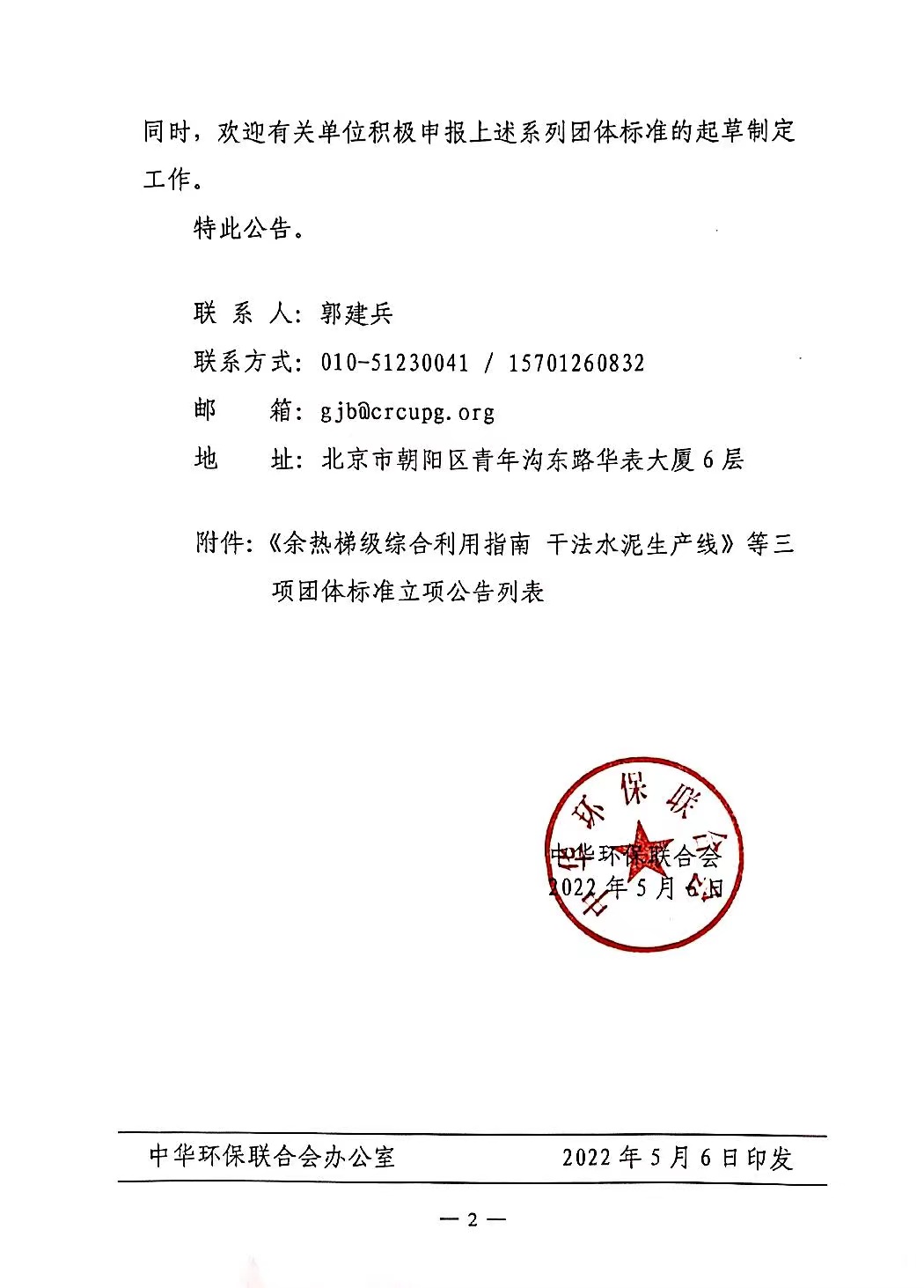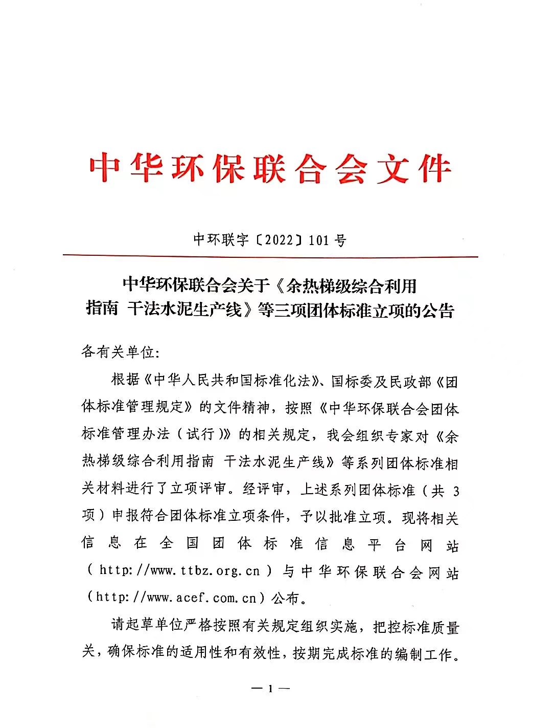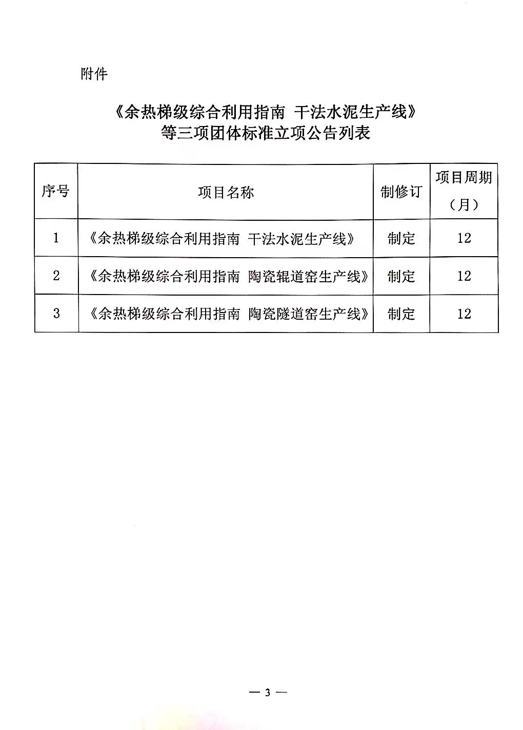 中华环保联合会关于 《余热梯级综合利用指南 干法水泥生产线》 等三项团体标准立项的公告