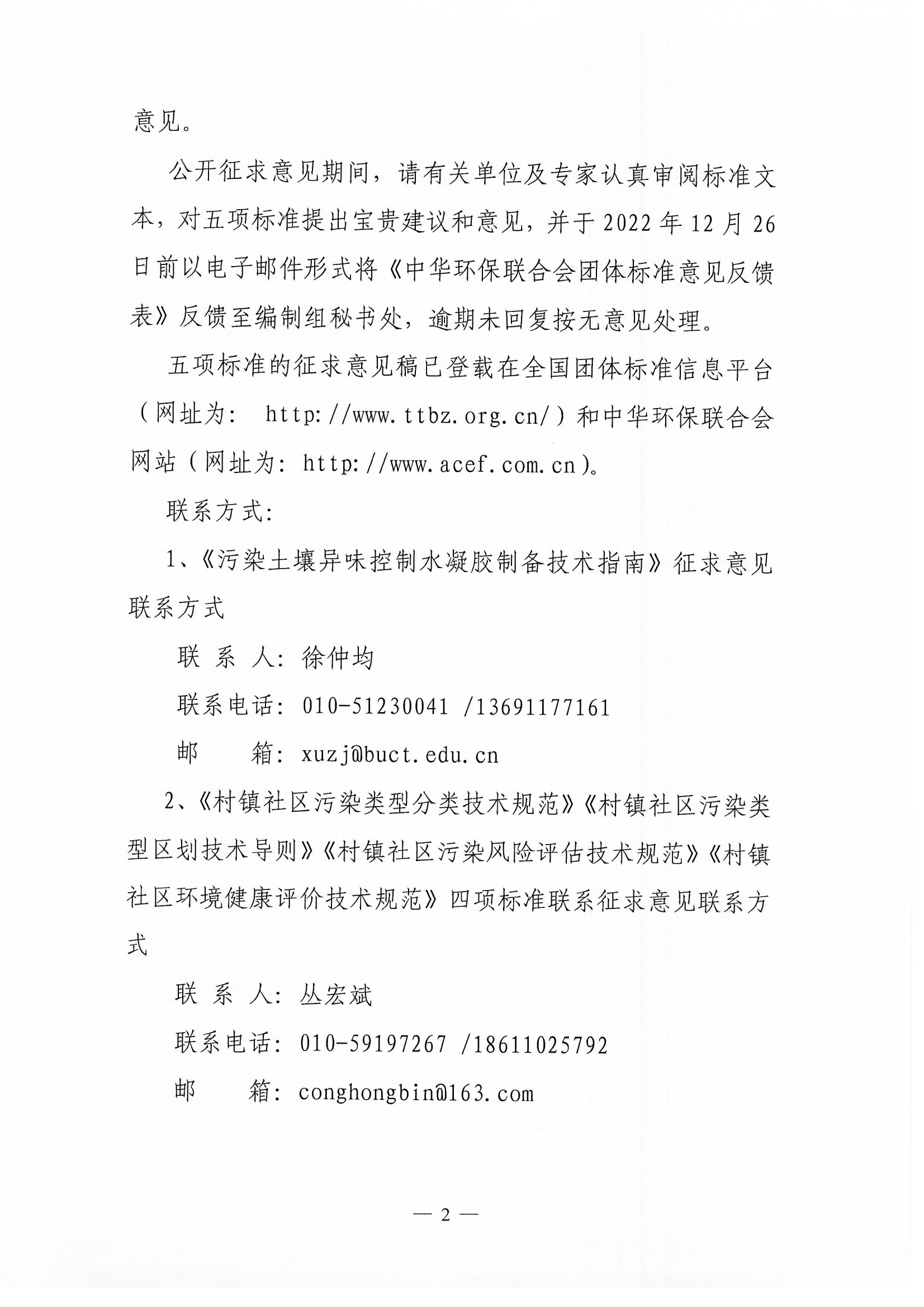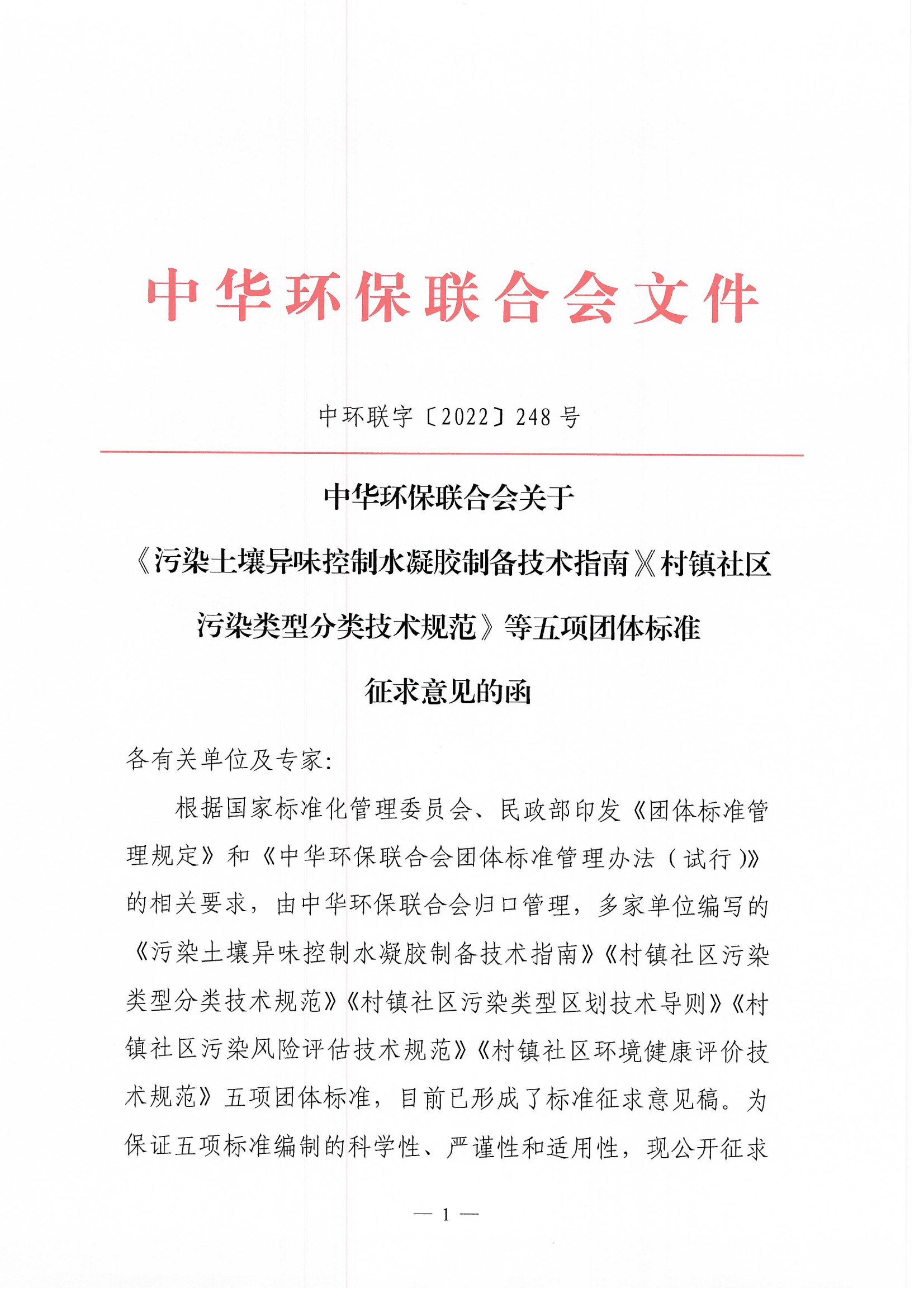 中华环保联合会关于《污染土壤异味控制水凝胶制备技术指南》《村镇社区污染类型分类技术规范》等五项团体标准征求意见的函