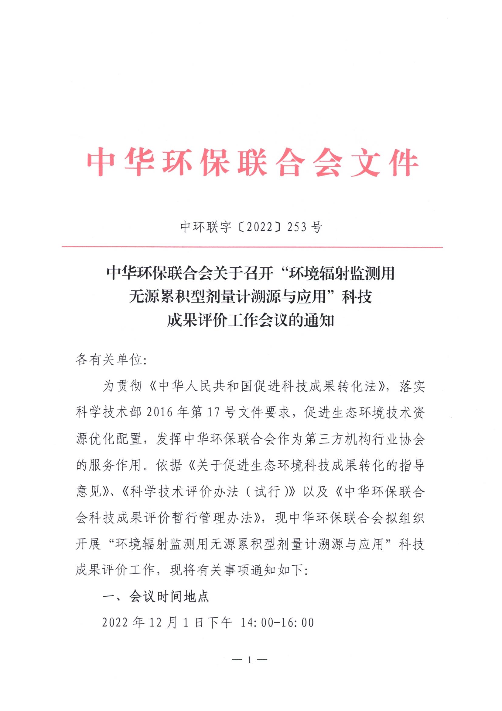 关于召开“环境辐射监测用无源累积型剂量计溯源与应用”科技成果评价工作会议的通知