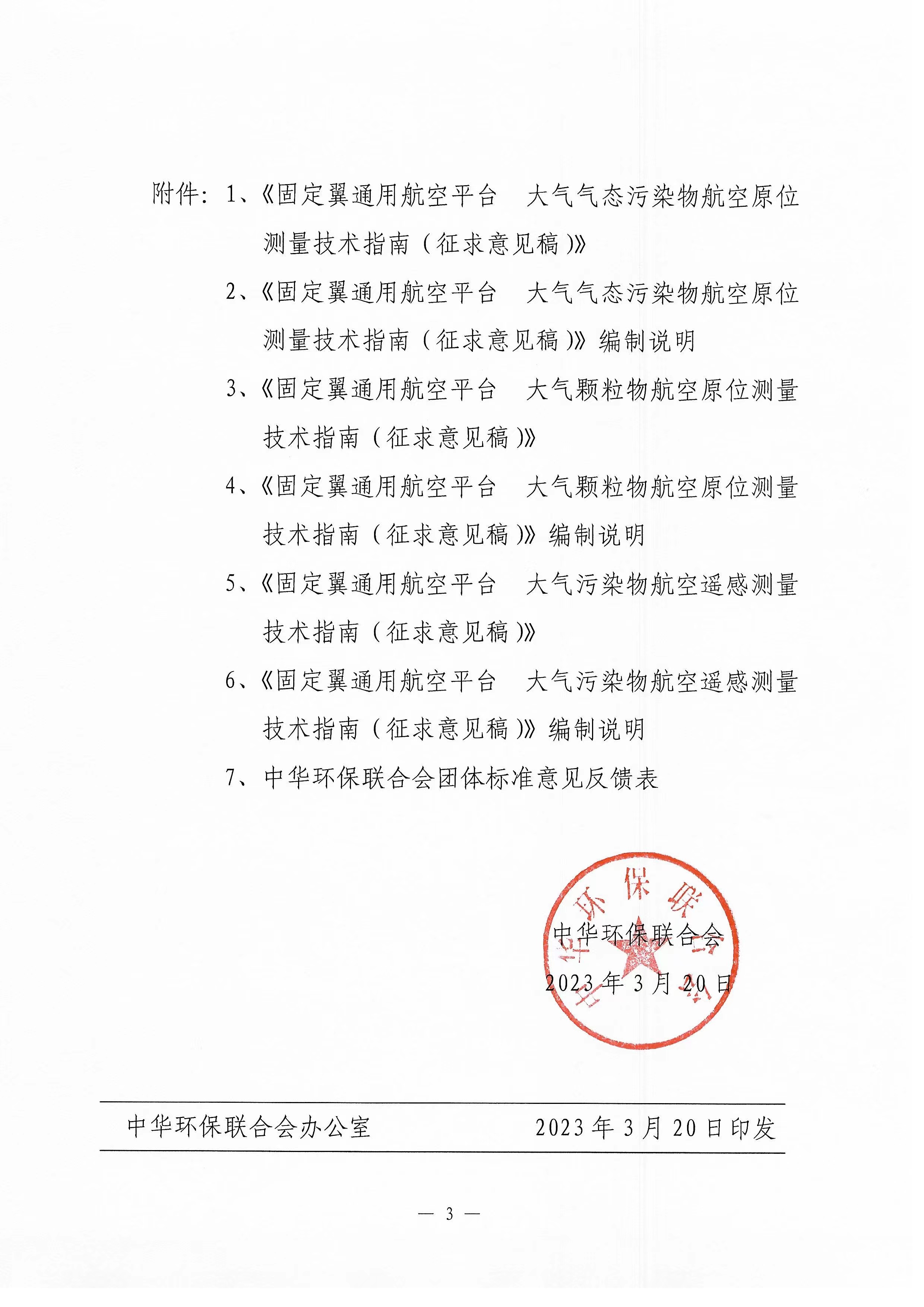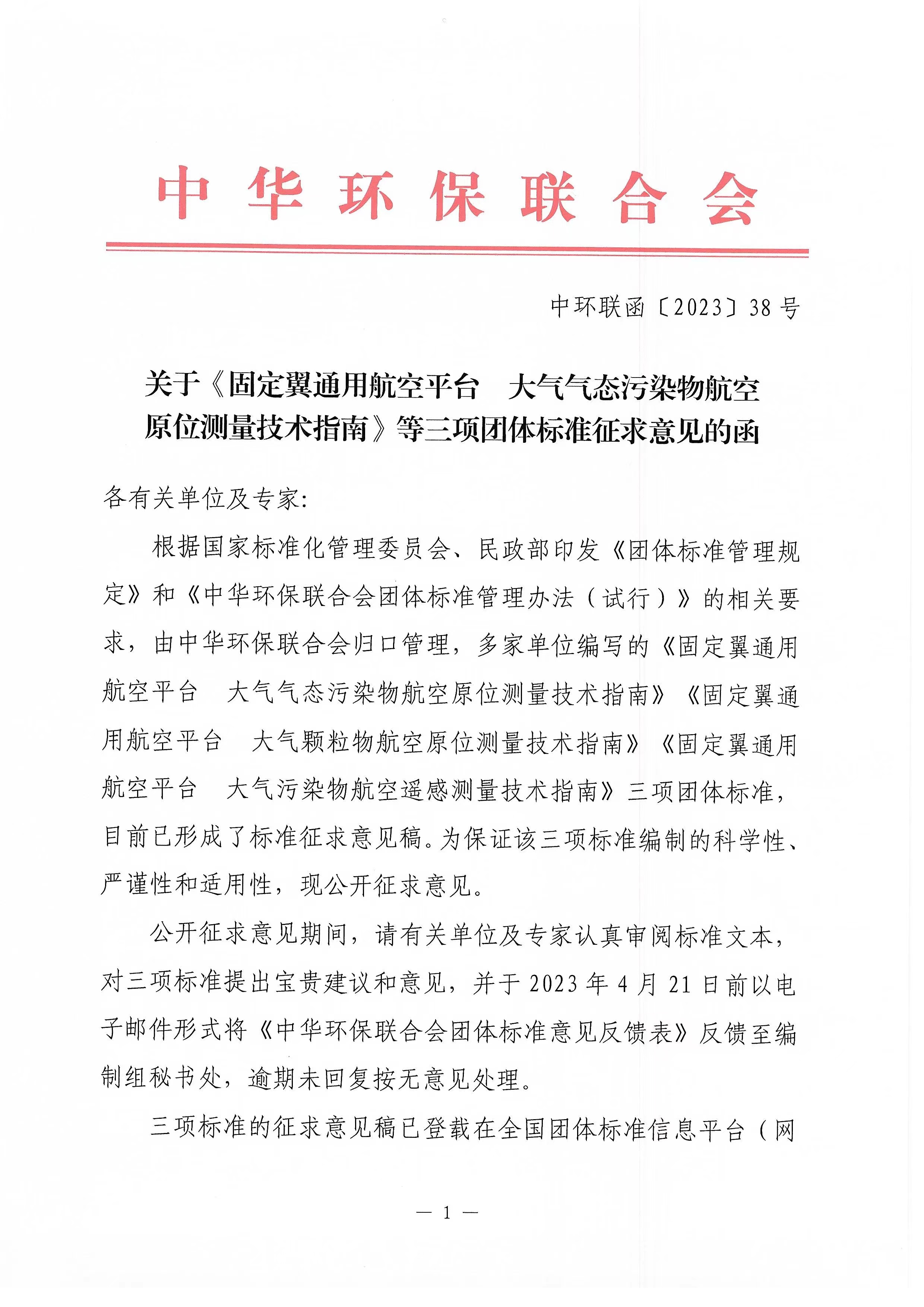 关于《固定翼通用航空平台 大气气态污染物航空原位测量技术指南》等三项团体标准征求意见的函 |
