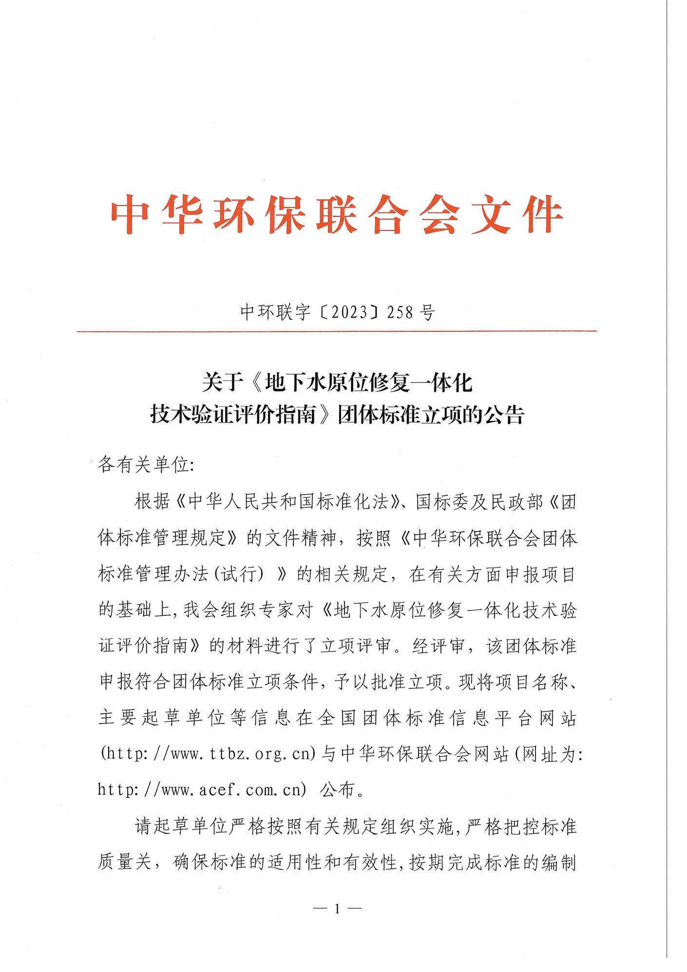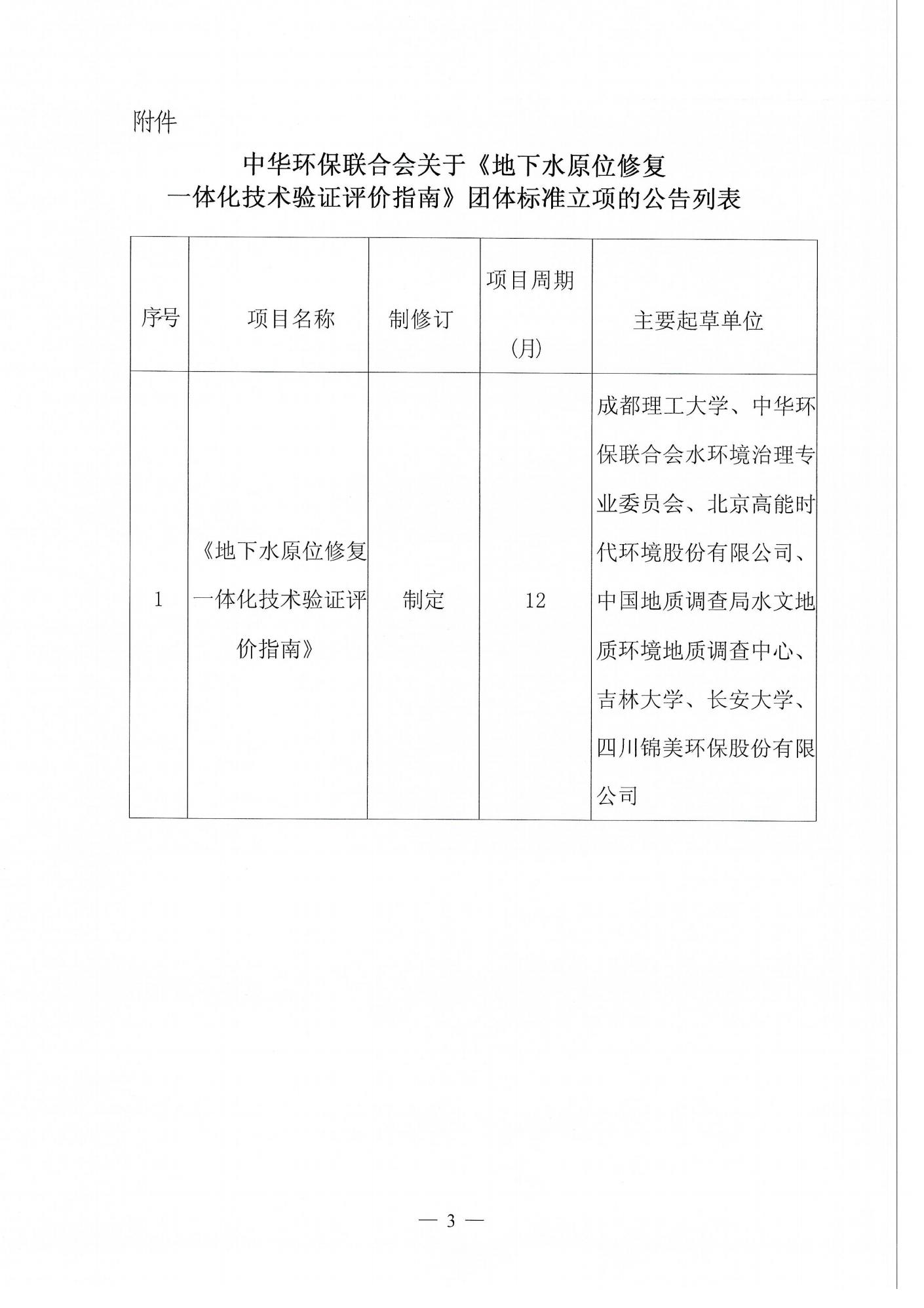 关于《地下水原位修复一体化技术验证评价指南》团体标准立项的公告