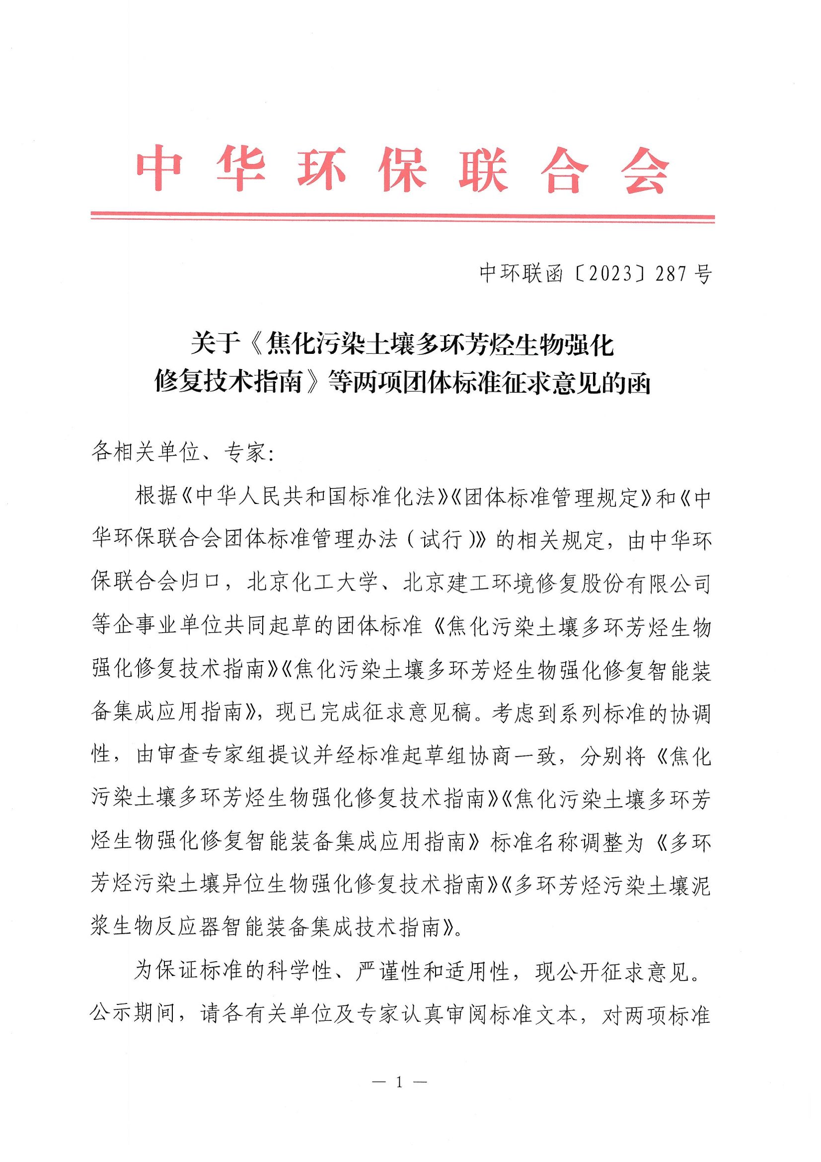 关于《焦化污染土壤多环芳烃生物强化修复技术指南》等两项团体标准征求意见的函