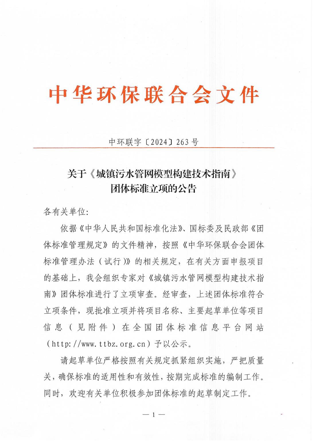 关于《城镇污水管网模型构建技术指南》团体标准立项的公告