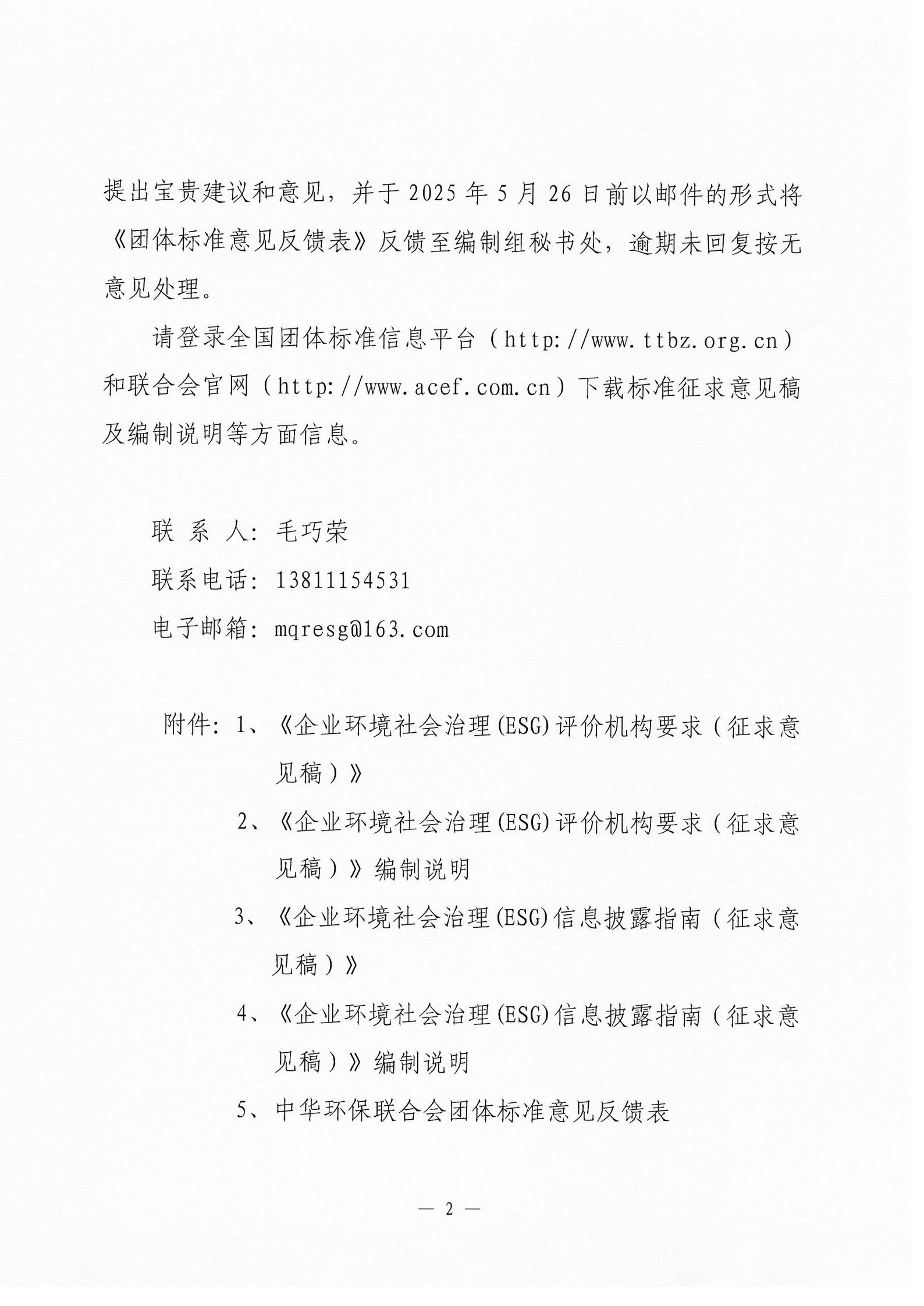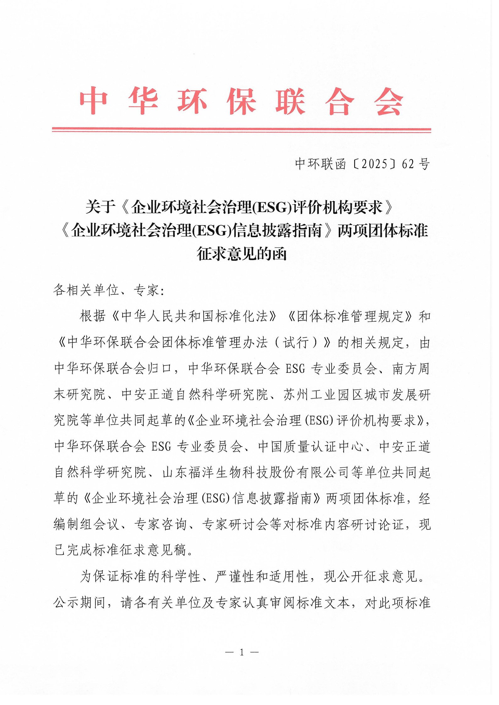关于《企业环境社会治理(ESG)评价机构要求》两项团体标准征求意见的函