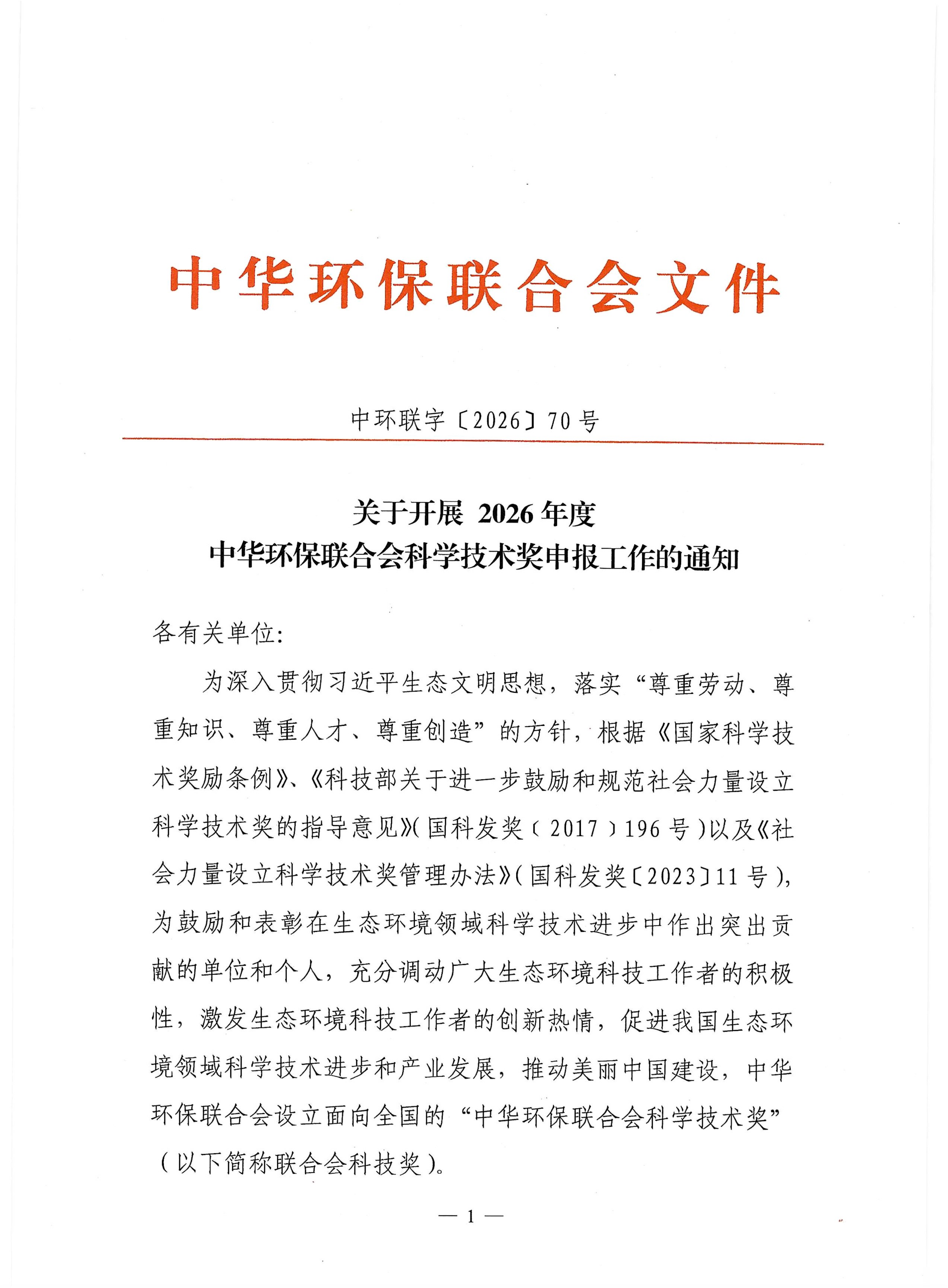 关于开展 2026年度中华环保联合会科学技术奖申报工作的通知