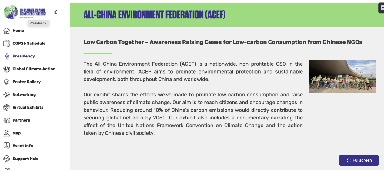 由于新冠疫情,本次气候大会首次建立了线上参会平台(cop26platform.unfccc.int)供各国代表参与大会并开展交流活动。中华环保联合会作为气候变化公约观察员机构,在两周会议期间,组织了相关线上会议及展览,展示了来自中国民间的气候行动。以下是相关内容集锦: