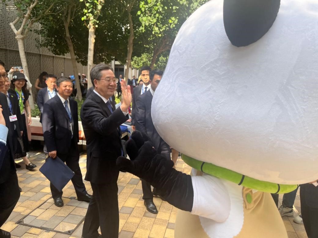 中共中央政治局常委、国务院副总理丁薛祥在“中国角”展台及活动区,了解中华环保联合会团队参与设计制作的可持续纪念品、熊猫主题雕塑和玩偶。