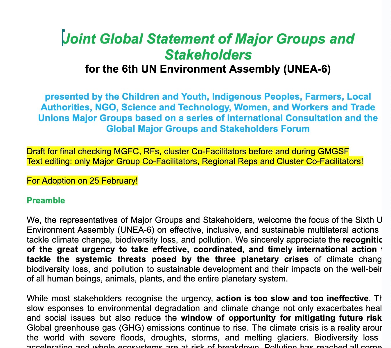图2  经多轮意见征集和现场研讨,会议最终形成了全球民间组织立场书并提交大会秘书处。上图为正在修订中的版本。