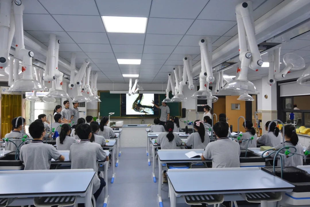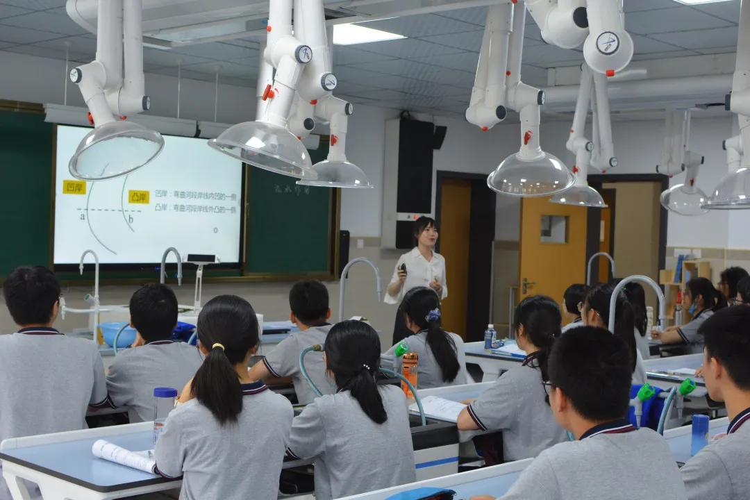 几乎与此同时,杭高钱江校区地理学科教室里,青年教师滕静超正带着同学们进行一堂主题为“流水作用”的地理实验课。同学们亲自动手,模拟探讨河流凹岸与凸岸的成因。而杭高钱江地理教研组长叶琴老师则为大家做了关于杭高钱塘江文化研学活动及校本课程建设情况的汇报。