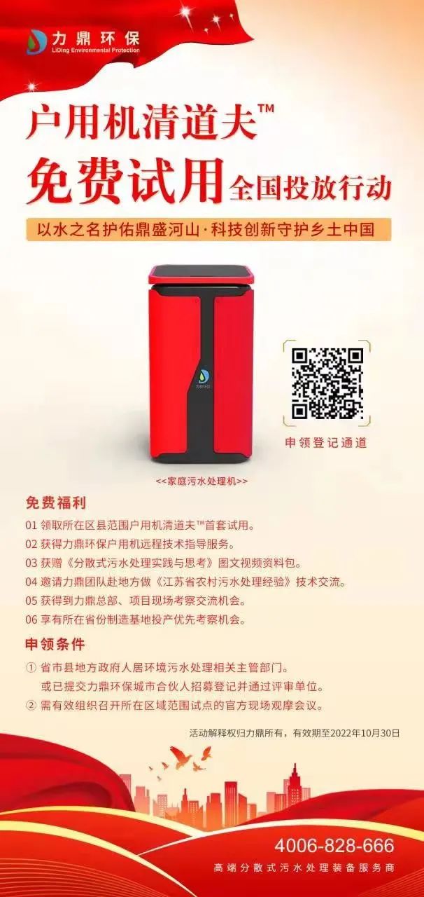乡土是人永恒的故乡,理应以毕生来守护。户用机工艺则是力鼎多年智慧与奋斗的结晶,此时此刻它仍宛若一个孩童,与我们、与故乡一同成长。期待广大地区通过试用得以比较,为一方人居环境提升的有效性方案提供强有力的样板支撑,详见公众号分散污水处理专家,活动海报。