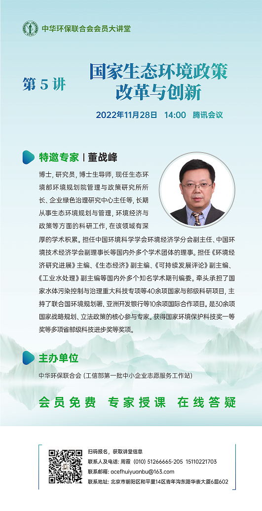 为更好的服务于会员企业,进一步搭建会员企业沟通交流的平台,助力会员企业发展,发挥中华环保联合会作为工信部第一批中小企业志愿服务工作站的作用,11月28日14:00,以线上视频形式(腾讯会议)举办“中华环保联合会会员大讲堂”第五讲。