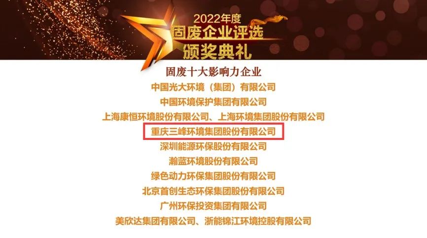 12月28至29日,由E20环境平台主办的“2022(第十六届)固废战略论坛”在深圳成功举办。论坛现场隆重揭晓了“2022年度固废十大影响力企业”榜单,三峰环境集团凭借着在科技创新、精细化管理、海外市场拓展、资本运营、项目建设、深化企业改革等方面取得的成就,连续第6年强势上榜。