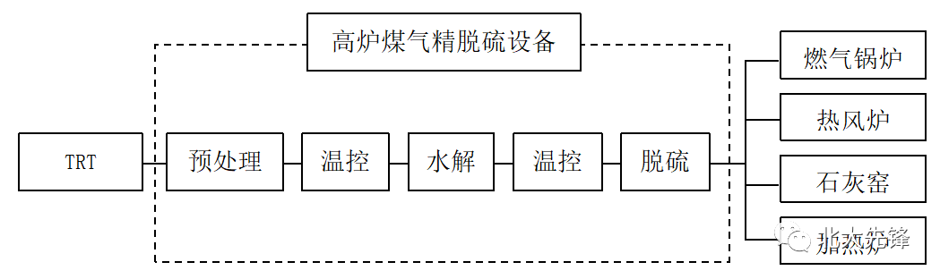 该项目由北大先锋与西安航天源动力工程有限公司合作共同建造,北大先锋负责核心技术、设备、试剂、工艺包,西安航天公司负责总包工程。唐银钢铁高炉煤气经除尘、TRT发电后,输送至精脱硫系统,达到超低排放标准的高炉煤气再送至燃气锅炉、热风炉、石灰窑、加热炉等末端用气点使用(见图1)。