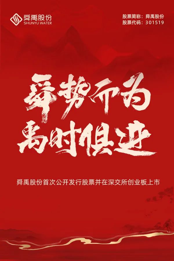 舜禹股份董事长邓帮武在上市致辞中表示,舜禹股份在深圳证券交易所创业板的成功上市,是公司发展史上一个重要的里程碑,意味着公司踏入了资本市场的快车道,开启新的征途。舜禹股份登陆资本市场后将继续对标对表国家产业发展趋势,充分发挥专精特新“小巨人”优势,不断加强技术创新,瞄准市场需求,坚持拓宽一米、深挖百米的市场开发战略,确保业绩的稳健增长。