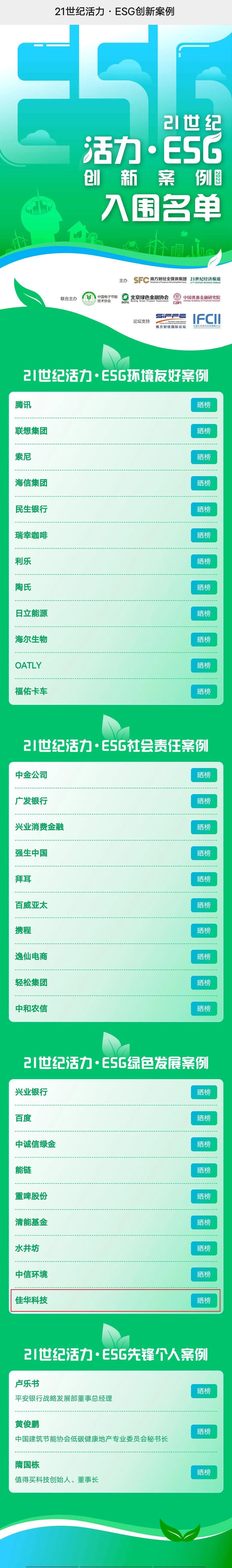会上,《21世纪“活力·ESG”实践案例集锦(2023)》正式发布,共有来自地方政府、中央企业、跨国公司、头部企业、金融机构、个人代表等近百个案例参与评选,最终经过案例初筛、网络投票、专家评审等层层评选,选出了30余个优秀案例。佳华科技以《立足ESG视野 创新推动绿色发展》为题的案例成功入围。