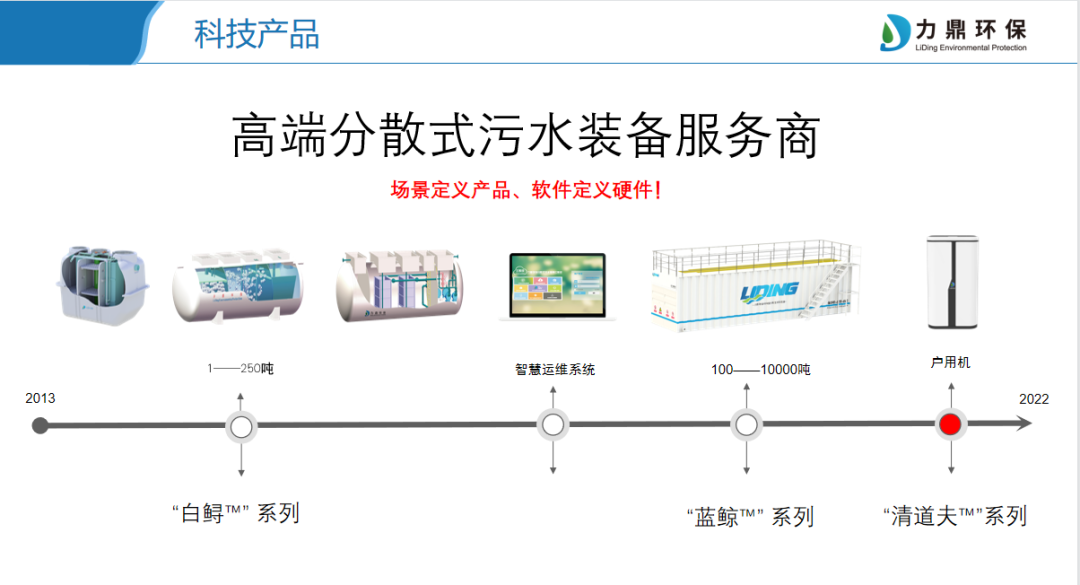 4大品牌系列产品,囊括各类分散式场景污水处理:清道夫®户用机系列、白鲟®小型集中系列(LD-SA净化槽、LD-SC、LD-SMBR一体化污水处理设备)、蓝鲸®城镇千吨以上系列(LD-JM镇级装配式水厂、LD-BZ预制泵站、LD-SLE渗滤液、LD-SDW净水设备)、桃花水母®智慧运营系列LD-iCloudDat云平台。