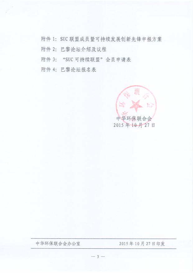 中华环保联合会关于参加巴黎联合国气候变化大会边会及“SUC联盟暨资源高效可持续发展创新先锋”推介的通知