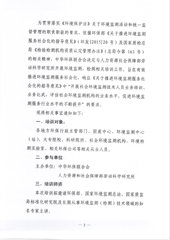 中华环保联合会关于举办《环境监测技术人员》2016年第一期专业能力培训的通知