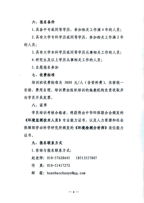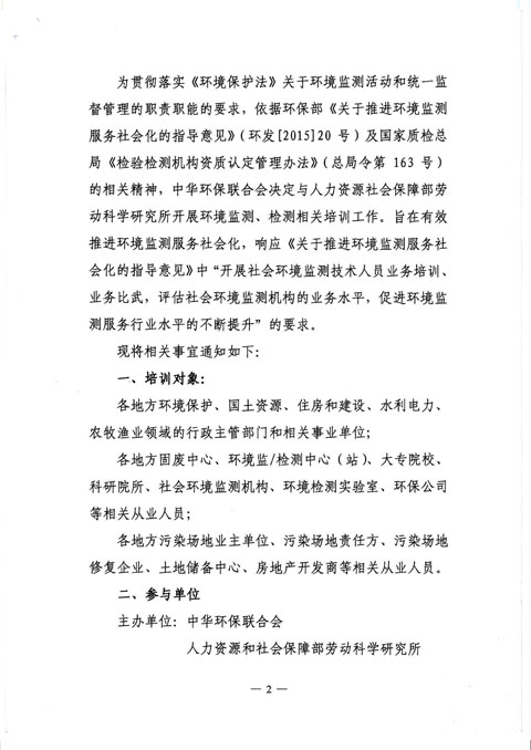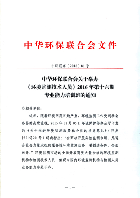 中华环保联合会关于举办《环境监测技术人员》2016年第十六期专业能力培训班的通知