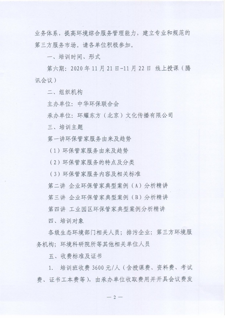 中华环保联合会关于举办2020年第六期 “ 环保管家 ” 案例精讲培训班的通知
