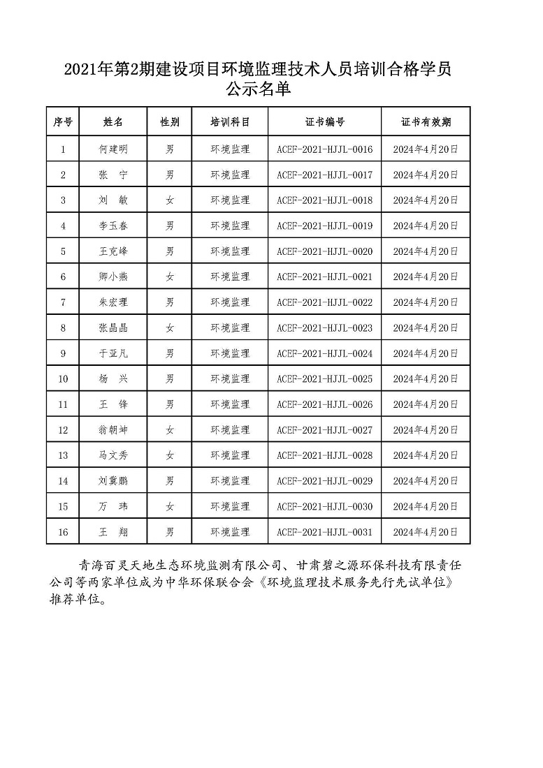 2021年第2期建设项目环境监理技术人员培训合格学员公示