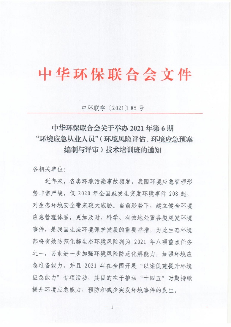 关于举办2021年第6期“环境应急从业人员”(环境风险评估、环境应急预案编制与评审)技术培训班的通知