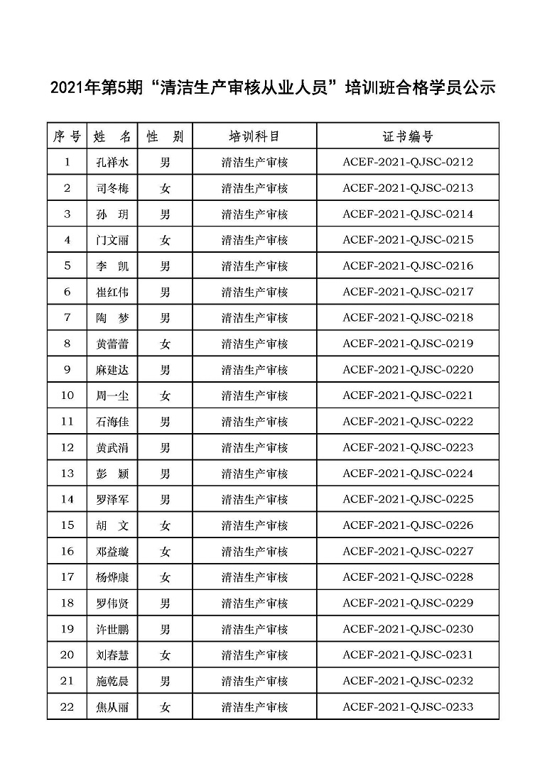 2021年第5期“清洁生产审核从业人员”培训班合格学员公示