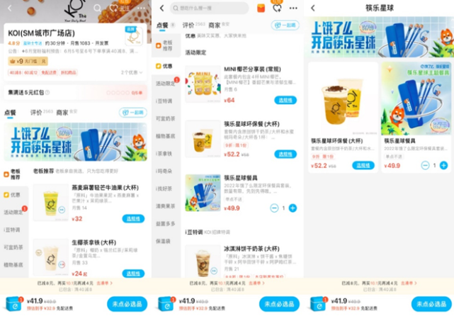 在湖里区SM城市广场附近的KOI外卖店可以见到,“筷乐星球”单套餐具的标价为49.9元,使用专属优惠券后仅需0.1元。餐具套装中包含融入“饿小宝”元素的筷子、汤勺以及吸管,造型惹人喜爱。