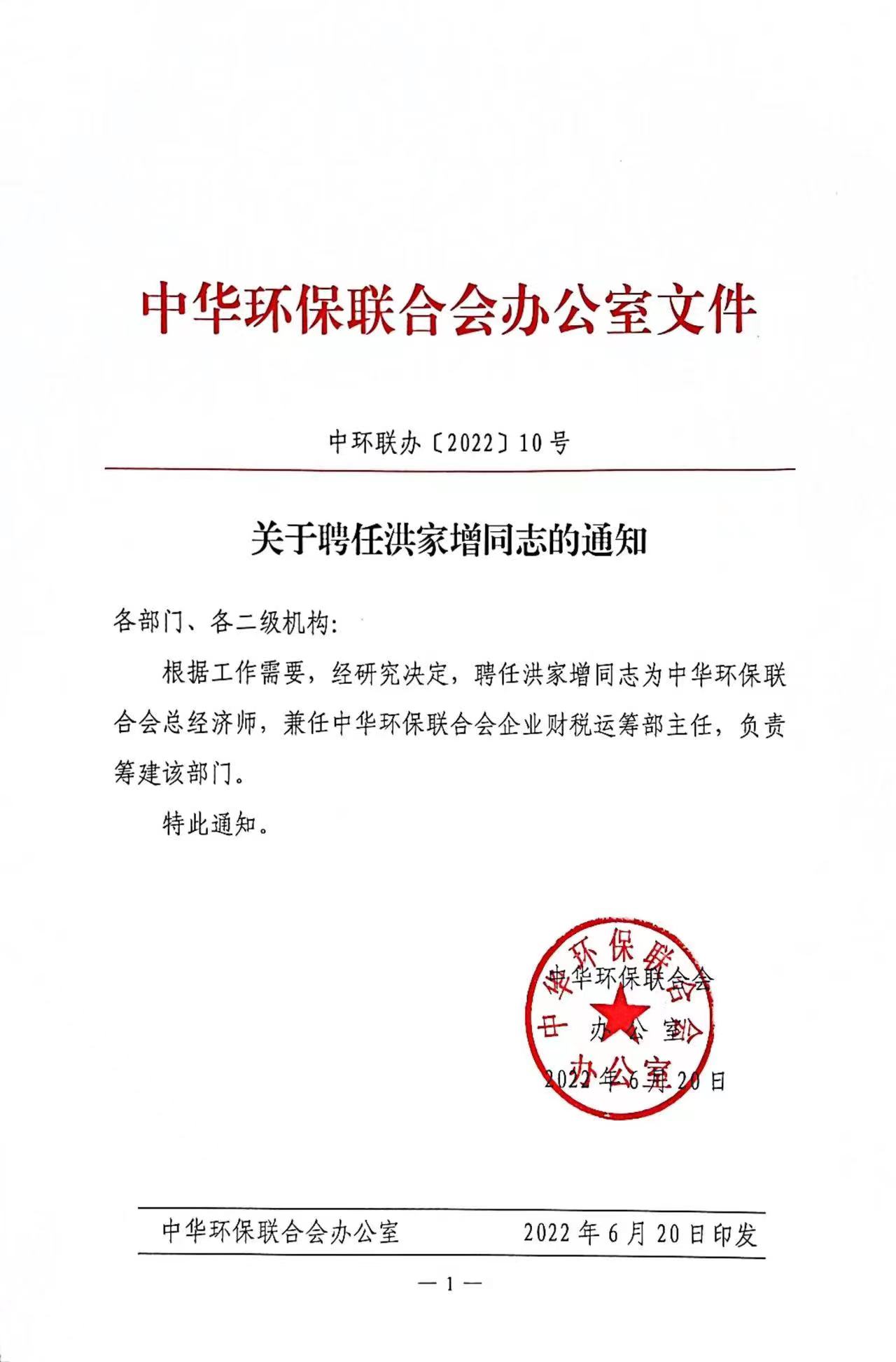 关于聘任洪家增同志的通知