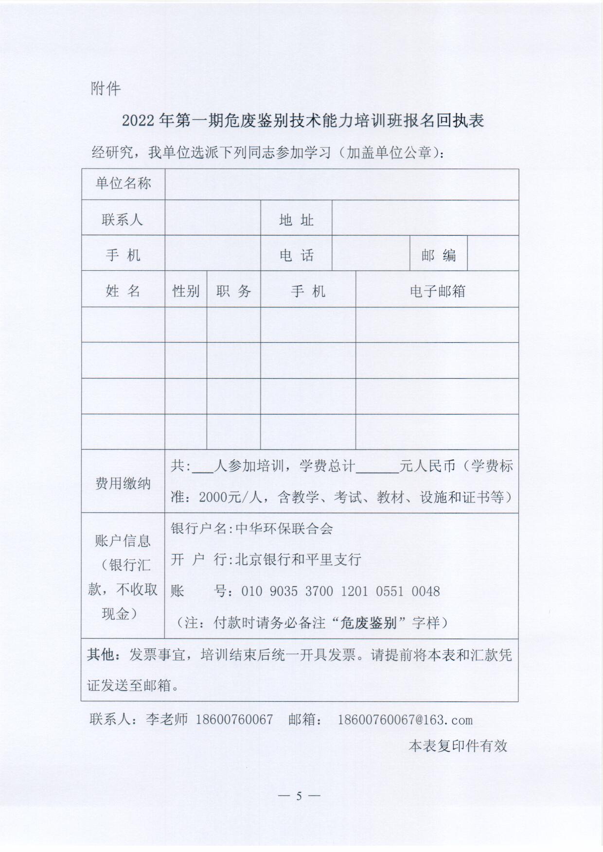 2022年第一期危废鉴别技术能力培训班报名回执表