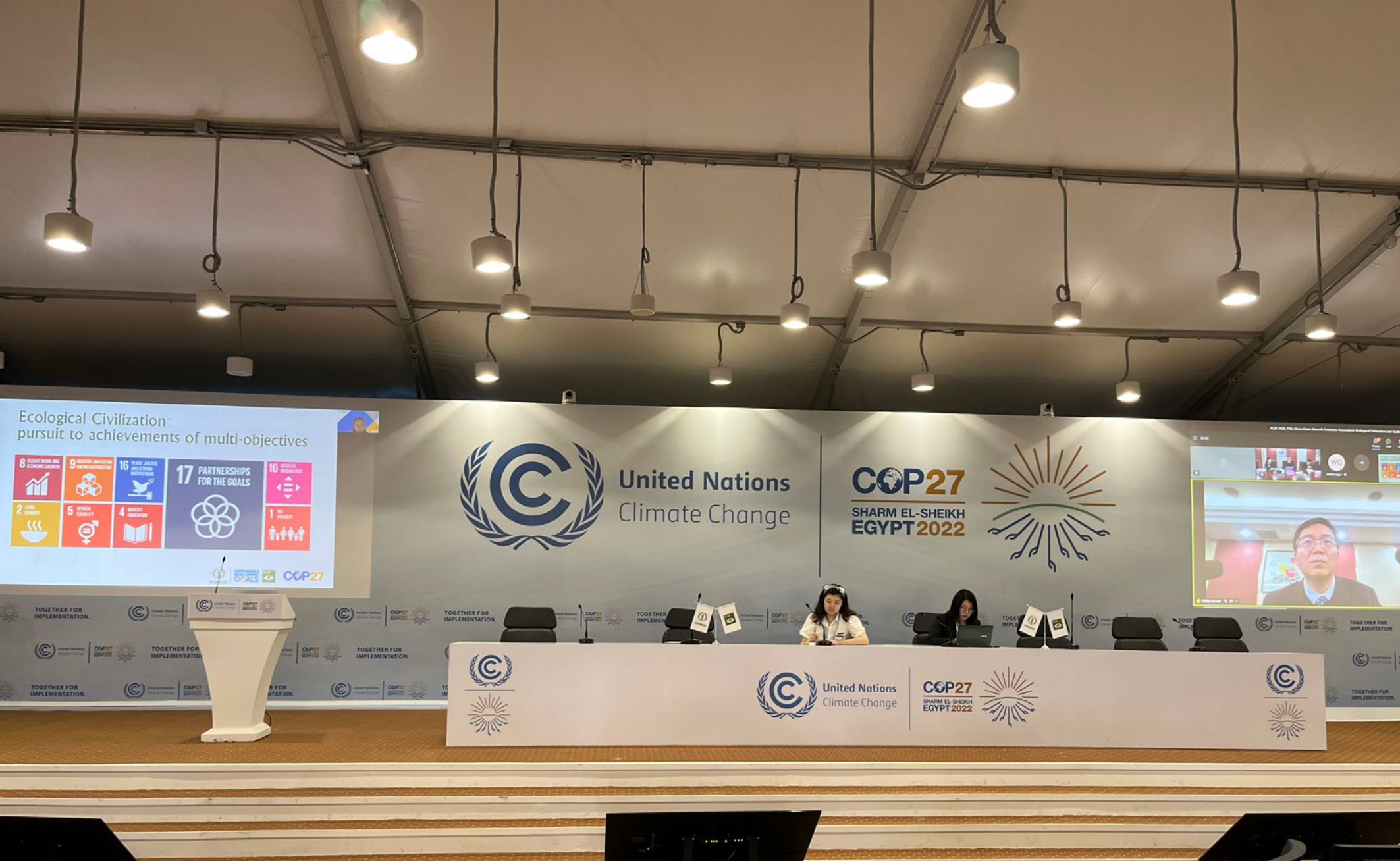 埃及时间11月12日下午,中华环保联合会于《联合国气候变化框架公约》第二十七次缔约方大会第四官方边会会议室举办了“生态文明与应对气候变化”主题边会,中央社会主义研究院陆琼博士、北京市丰台区教委杨晓辉主任、北京市第十八中学校长管杰、北京市第十八中学马艺原同学以及专注生态保护、可持续能源、塑料污染治理等领域的行业组织、企业代表线上、线下出席了会议,并作了主题分享,旨在为更好的向国际社会传播生态文明理念,促进重要环境议题与应对气候变化之间的协同。中华环保联合会副秘书长李瑞东致辞发言,会议由中华环保联合会国际部副部长倪垚主持。