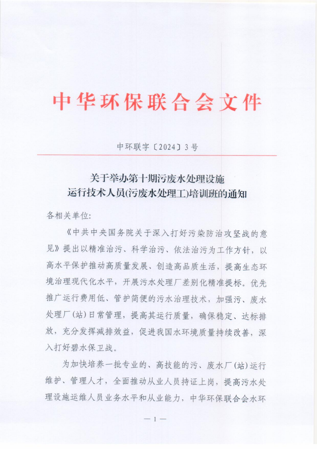 关于举办第十期污废水处理设施运行技术人员(污废水处理工)培训班的通知