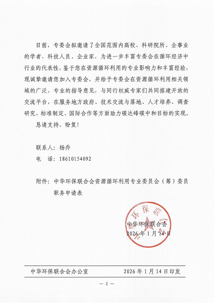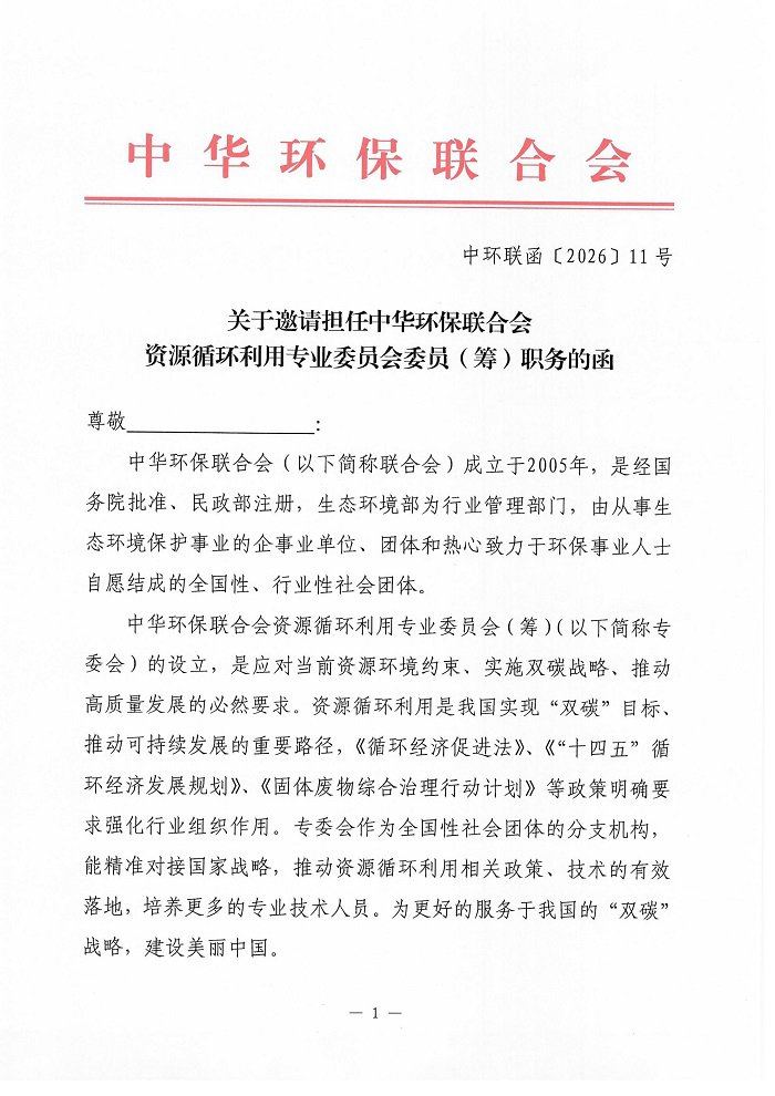 关于邀请担任中华环保联合会 资源循环利用专业委员会委员(筹)职务的函