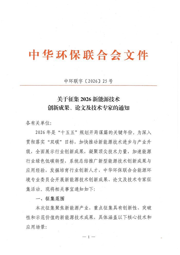 关于征集2026新能源技术创新成果、论文及技术专家的通知