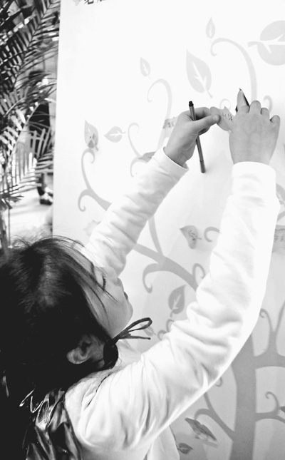3月27日,一位环保“绿色小超人”把酒店客人的签名贴在象征生态地球的“绿树叶”上。