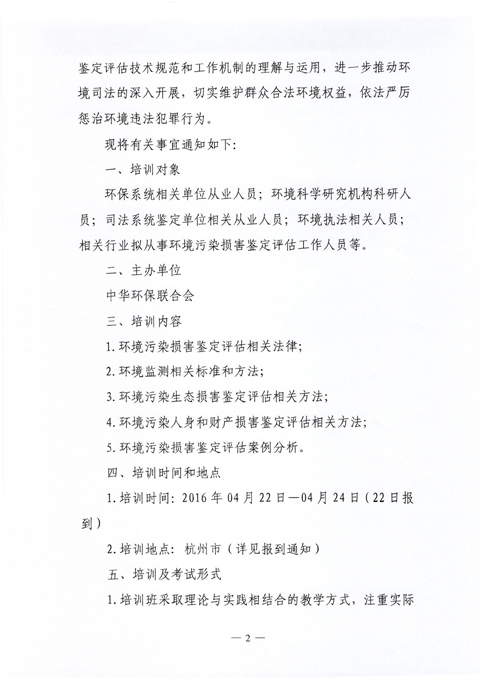 中华环保联合会关于举办《全国环境损害鉴定执业能力》2016年第四期岗位培训班的通知