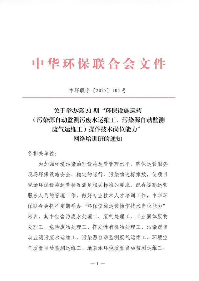 关于举办第31期“环保设施运营(污染源自动监测污废水运维工、污染源自动监测废气运维工)操作技术岗位能力”网络培训班的通知