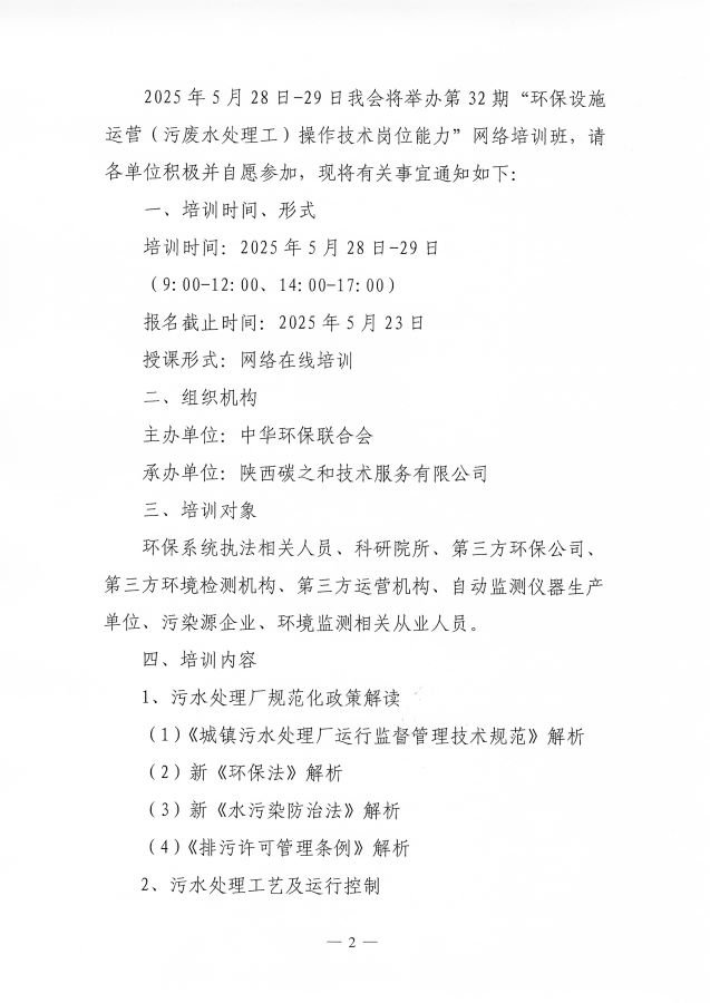 关于举办第32期“环保设施运营(污废水处理工)操作技术岗位能力”网络培训班的通知