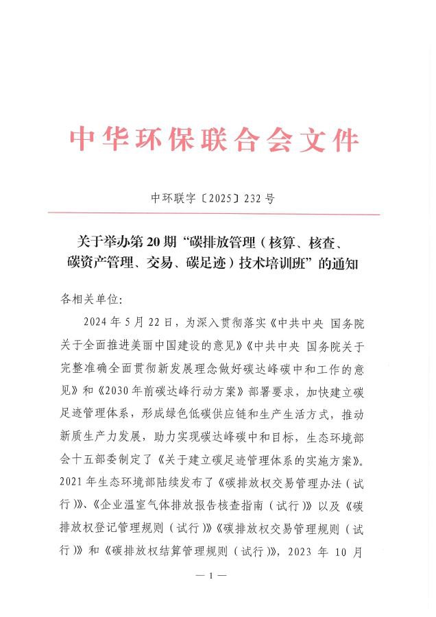 关于举办第20期“碳排放管理(核算、核查、碳资产管理、交易、碳足迹)技术培训班”的通知