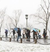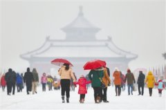 昨日,天坛,丹陛桥往祈年殿方向,游客雪中游园。新京报记者尹亚飞摄与京城四次擦肩而过的2013年冬季第一场雪昨日姗姗来迟,这也成为第三晚的初雪记录,仅比史上最晚初...
