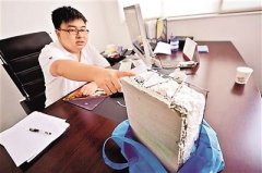 图为范犇介绍自己的高科技产品。只需一半的施工时间,就能造出比传统房子节能60%、重量轻3/4的新型节能环保建筑,而且隔音、防火、防潮、抗震指标遥遥领先——这并非...