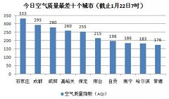 人民网北京1月22日电(蒋琪)根据环保部公布的最新数据,截至今天早上7时,石家庄的AQI(空气质量指数)达到333,属于六级严重污染,成为161个参与空气质量排...