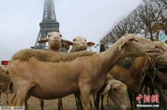 当地时间2014年11月27日,法国巴黎,法国农民带绵羊在埃菲尔铁塔附近抗议,要求环保部门采取有效措施解决狼群袭击羊群问题。法国农民带绵羊在埃菲尔铁塔附近抗议法...