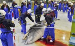 图片说明:今年4月26日,四艘日本捕鲸船在宫城县石卷市附近海域开展了一天的捕鲸行动,图为研究人员正在检查当天捕获的一头小须鲸。日本今年的捕鲸季已经开始。6月26...