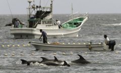 太地町海域的海豚。(自美联社)据《卫报》报道,美国海洋守护者协会表示,近日,包括幼豚、青年豚和罕见白豚在内的250多头海豚被日本渔民带到“臭名昭著”的太地町镇进...