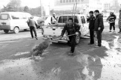 工作人员正在用沙子覆盖被油迹污染的路面。记者谭青摄 一辆油罐车(右)前来转移柴油。记者谭青摄 昨天上午11点左右,朝阳区姚家园路与青年北路交叉口处,一辆运输途中...